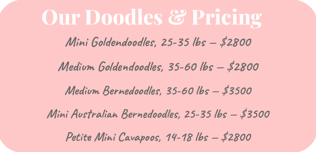 Our deposit amount is $500, which reserves a puppy for you in the litter of your choice. This is part of your total puppy payment.